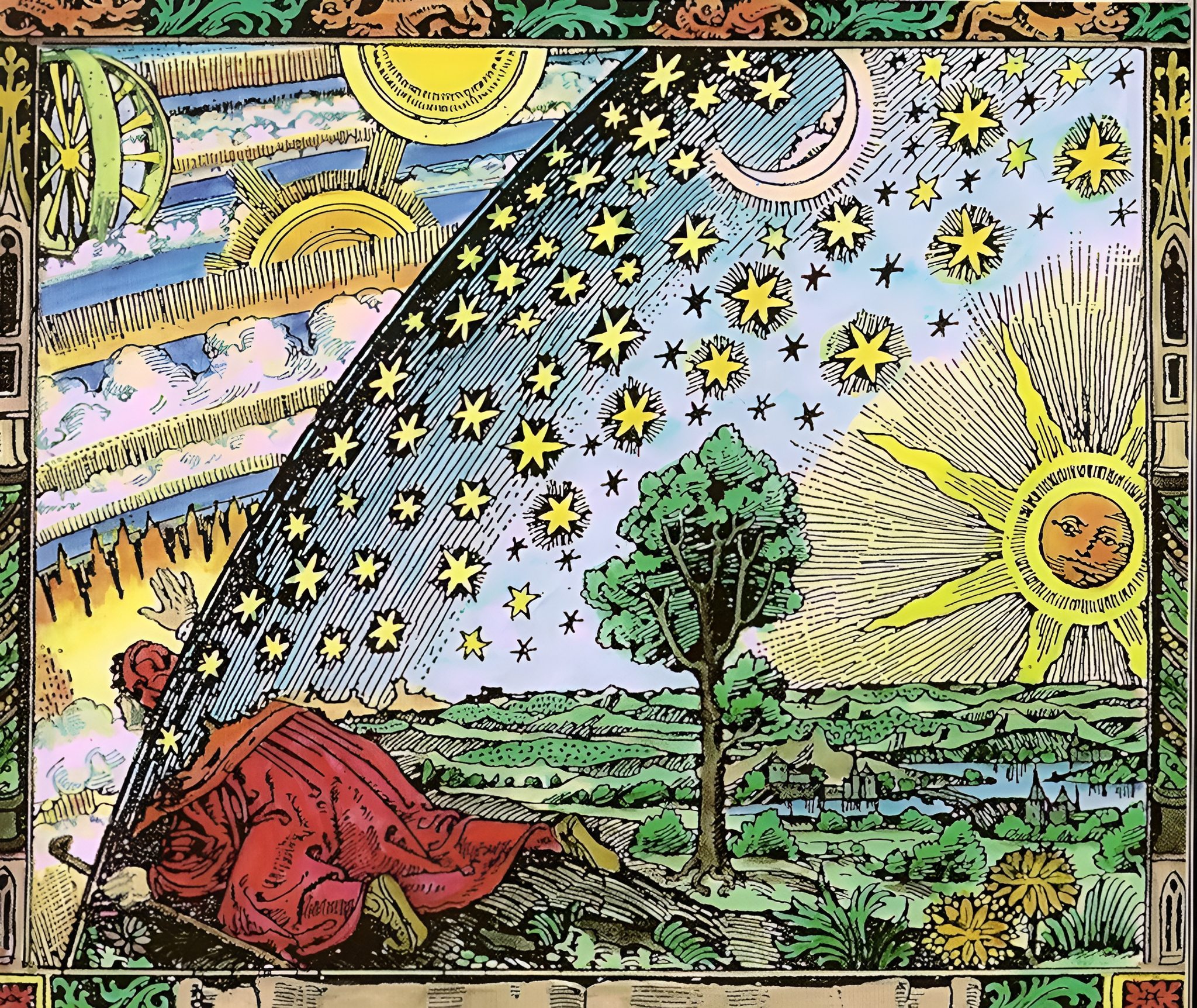Dieses Bild heißt die „der Wanderer am Weltenrand“ und ist ein alter Holzstich. Die Beschreibung des damaligen Autor Flammarion: „Ein Missionar des Mittelalters erzählt, dass er den Punkt gefunden hat, wo der Himmel und die Erde sich berühren …“–(Camille Flammarion: L’atmosphère, Paris 1888)